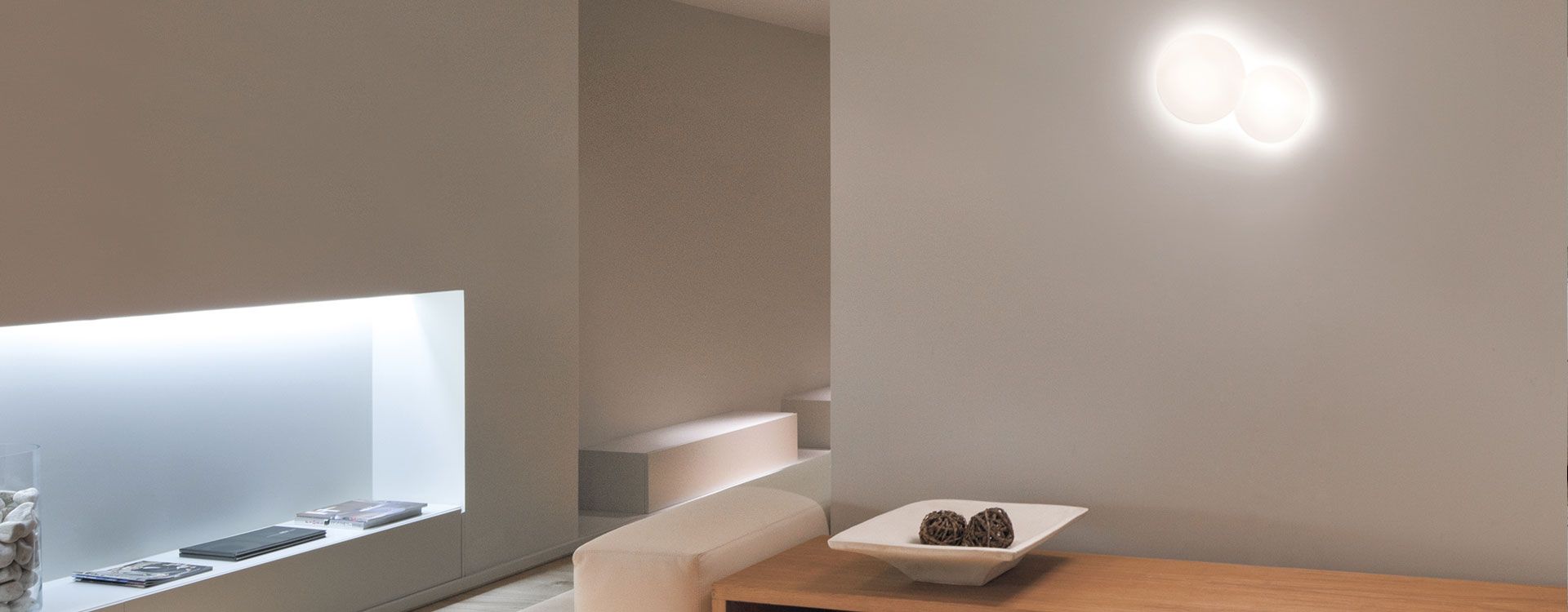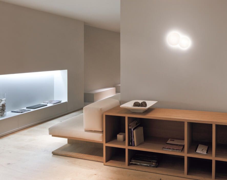 Una colección de apliques de pared con formas circulares. Vibia produce varios modelos, todos ellos con un único punto de conexión eléctrica. En esta lámpara de pared está presente el vidrio soplado opal mate triplex y la luz LED para producir una iluminación cálida, sin deslumbramientos ni sombras.