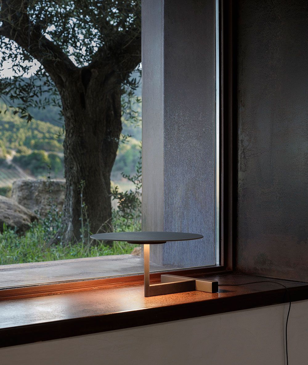 Las lámparas de pie y sobremesa de la colección Flat destacan por su versatilidad y elegancia.Disponibles en tamaños pequeños y grandes, pueden incorporar un disco simple o doble, ya sea en un formato compacto o tipo estante que, además de iluminar, funciona como un elemento de mobiliario.