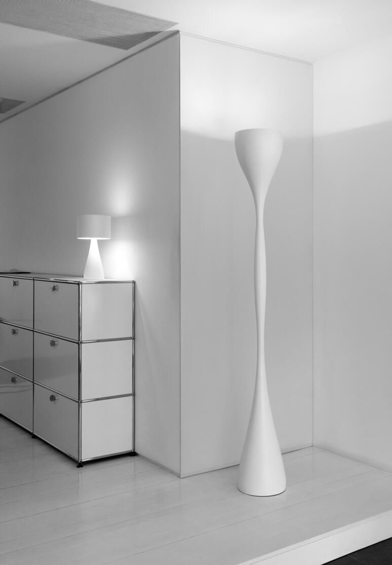 La lámpara Jazz distribuye una iluminación indirecta que ayuda a crear espacios íntimos y acogedores. La luminaria de pie Jazz posee regulador de intensidad en el cable.